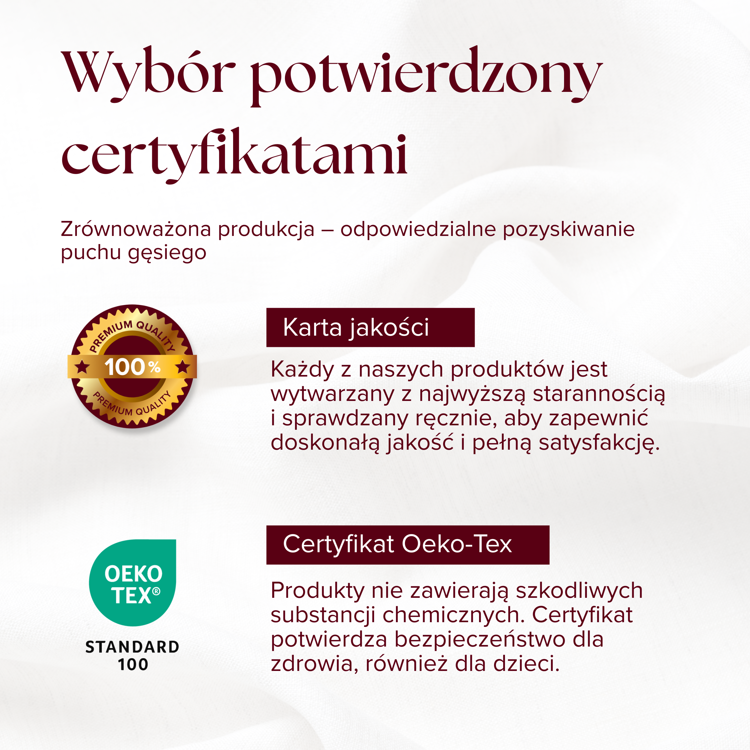 Doświadcz najwyższego komfortu snu – dzięki naszej kołdrze z gęsiego puchu premium. Nasza kołdra łączy w sobie luksusowe materiały, sprawdzoną jakość i zrównoważoną produkcję. Wypełniona w 50% delikatnym gęsim puchem zapewnia przyjemne uczucie ciepła, które nie jest ani zbyt gorące, ani zbyt zimne – idealna letnie dni i noce. Certyfikowana jakość i odpowiedzialność etyczna. Każdy puch pochodzi ze źródeł, które gwarantują, że nie jest on pozyskiwany od żywych ptaków. Ponadto poszycie zostało przetestowane zgodnie z normą OEKO-TEX STANDARD 100 i nie zawiera substancji szkodliwych – idealne również dla wrażliwej skóry. Pielęgnacja i higiena Można prać w pralce w temperaturze do 30°C i suszyć w suszarce – dzięki temu kołdra pozostaje higieniczna, świeża i trwała. Dla alergików i zdrowego klimatu w sypialni. Specjalnie czyszczone i przetwarzane w celu zminimalizowania alergii – idealne dla osób o wrażliwym śnie. Szczegóły robią różnicę. Poszycie wykonane jest z delikatnej bawełnianej batysty, przetworzonej metodą pikowania kasetowego, dzięki czemu puch pozostaje równomiernie rozłożony. Dzięki starannemu wykonaniu nasze kołdry pozostają puszyste i zachowują swój kształt przez długi czas.