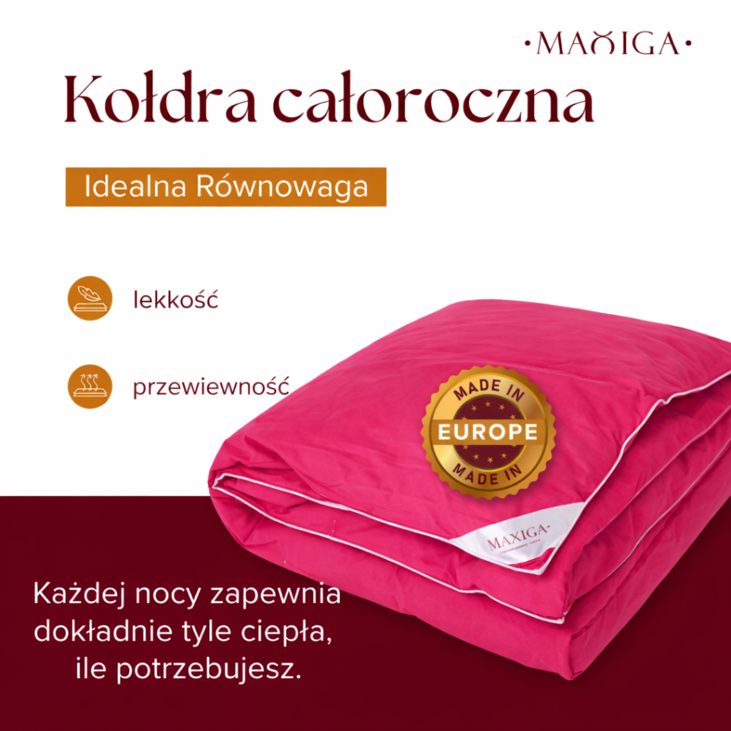 - Przyjemny klimat do spania przez cały rok – optymalna równowaga cieplna i oddychalność.