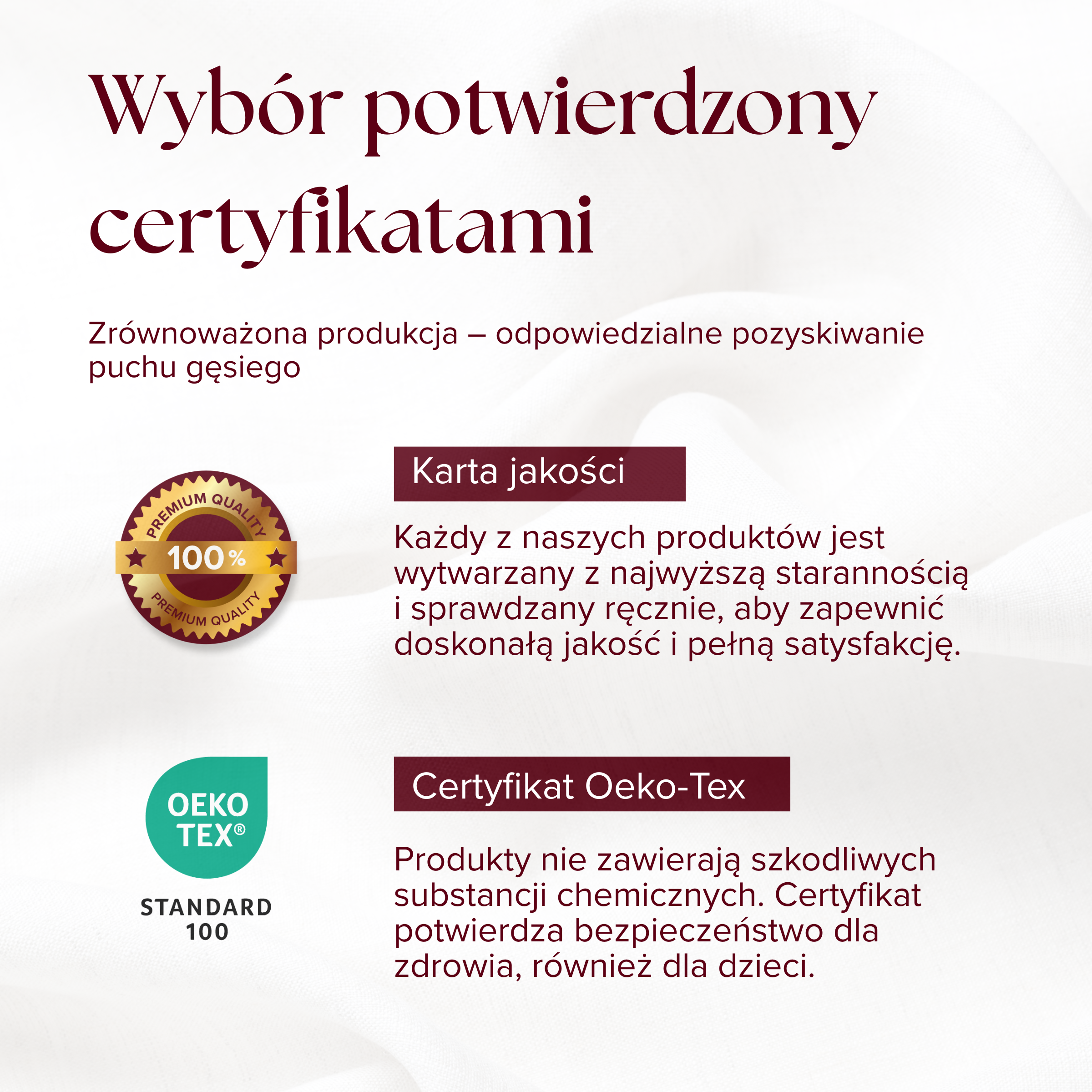- Etyczne i zrównoważone – gwarancja pochodzenia: bez skubania na żywo, bez kompromisów w zakresie dobrostanu zwierząt i jakości. Puch pochodzi z odpowiedzialnych, lokalnych źródeł. Polska = Wysoka jakość.